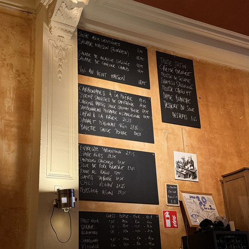 私はブリュッセルのグラン・プラスから徒歩7分程の場所で、シャルトルー通り9番地にある「Fin de Siècle」に行ってきました。席に着くとドリンクメニューが手渡され「フードメニューは壁にあるよ」と教えてもらえます。壁のメニューから食べたい料理を見つけるのにはちょっと苦戦しました。そうこうしていると「なんで1人なの!?今日はバレンタインじゃないか!ちなみに、こいつはすごくいい奴なんだよ!」と別のスタッフを指しながら話しかけてももらえます。すっかり忘れていましたが、この日はバレンタインデーでした。